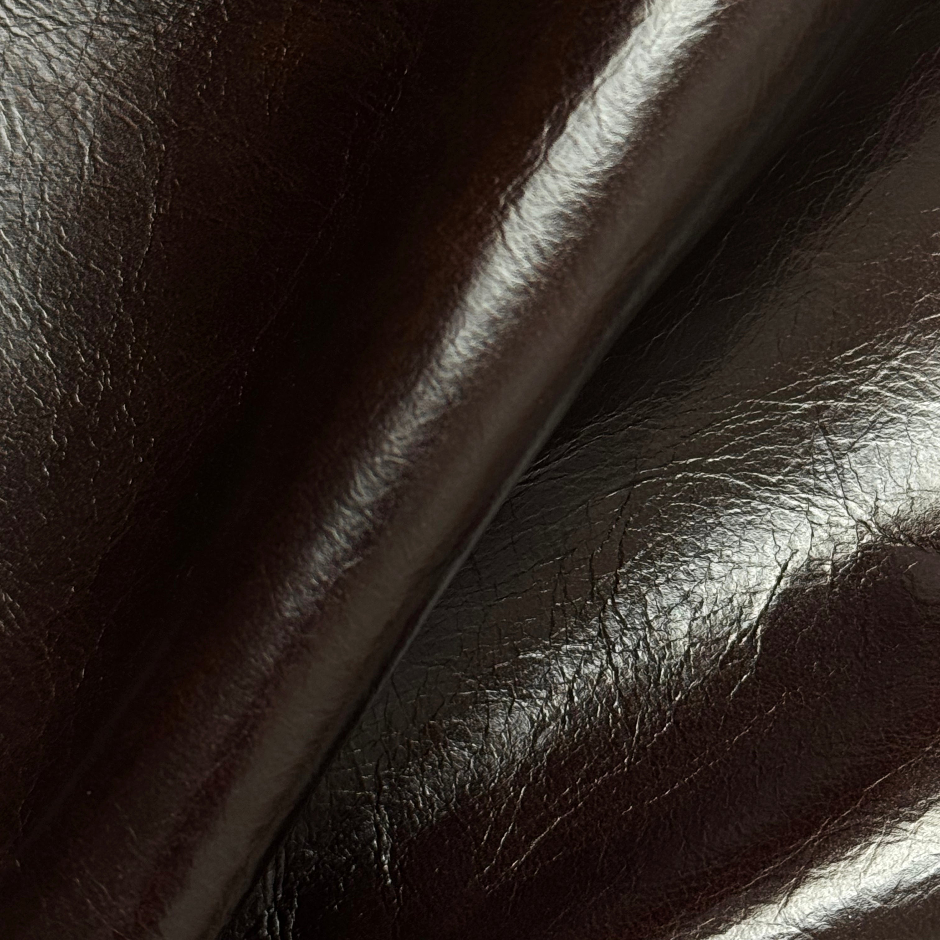 A premium Italian leather with a cracked texture and natural shine. Its surface creates a striking visual depth, giving each piece a bold and contemporary character.